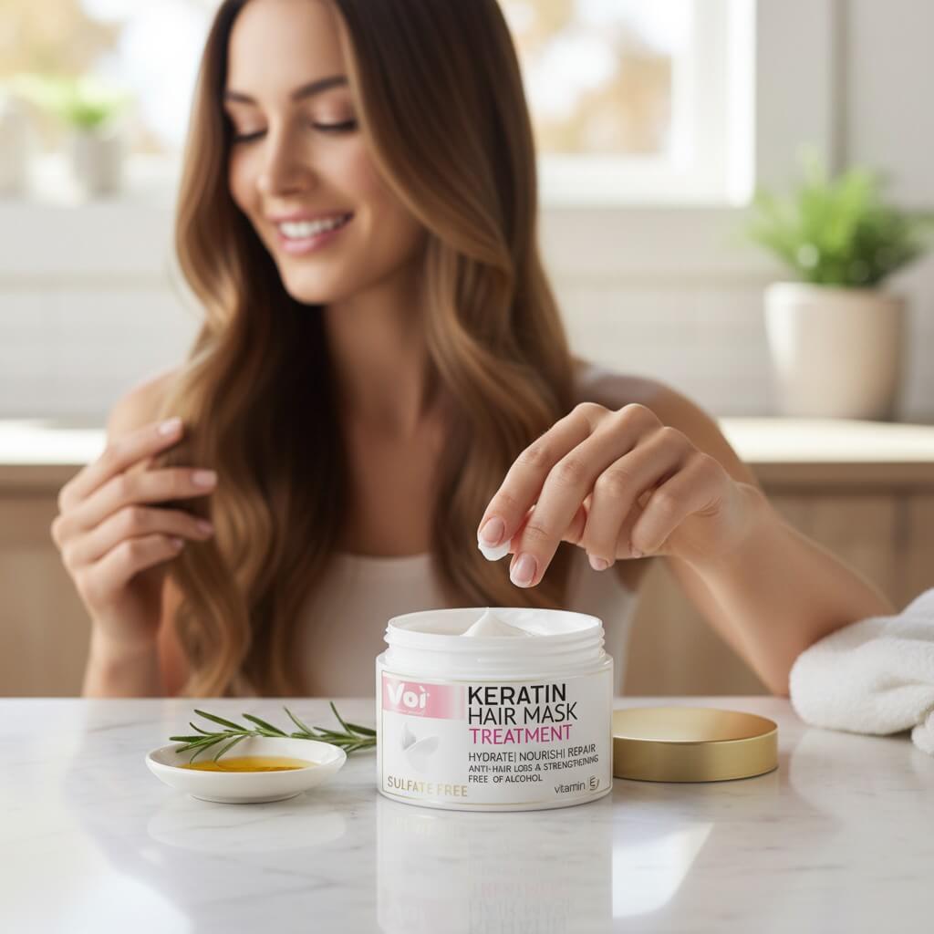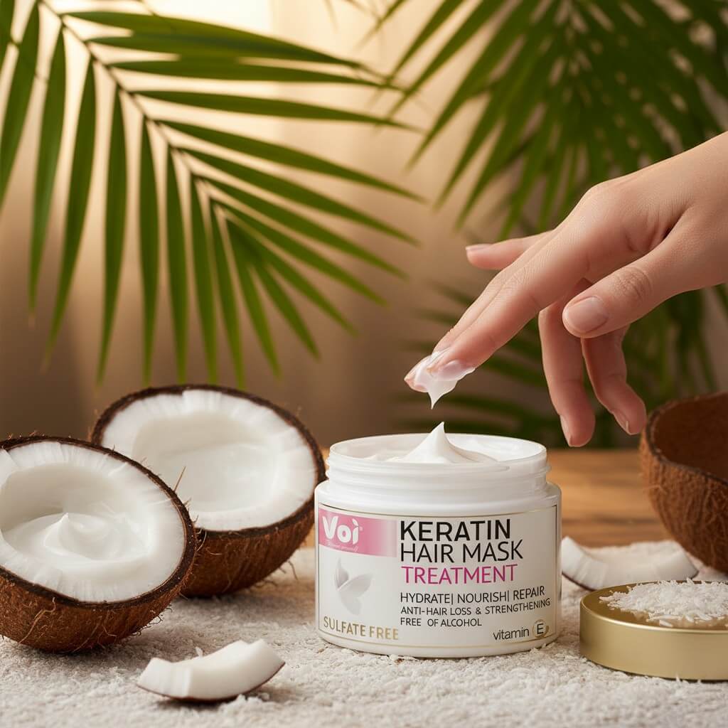 Redă frumusețea naturală a părului tău cu masca de păr cu keratină și ulei de cocos, un tratament intensiv pentru hidratare și regenerare.